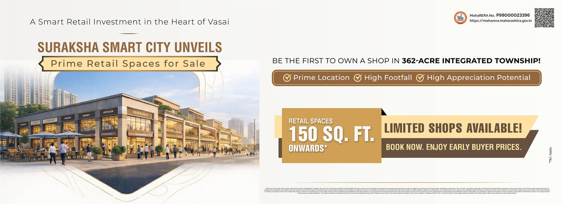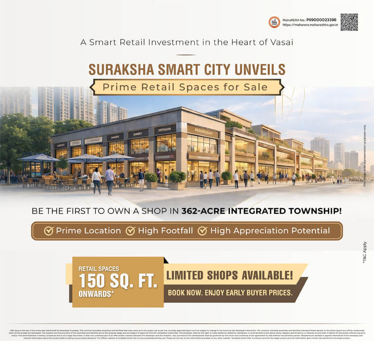 Now, a new tomorrow is taking shape in Vasai. Welcome to a self-sustaining township envisioned across 362 acres of prime and pristine land that will bring the best of life and lifestyle right where you are. From comforts to conveniences, amenities to experiences, and connectivity to facilities, the township of Suraksha Smart City will never leave you wanting more. Suraksha Smart City offers lush green environs, fresh air, a peaceful environment, and high-quality living standards.